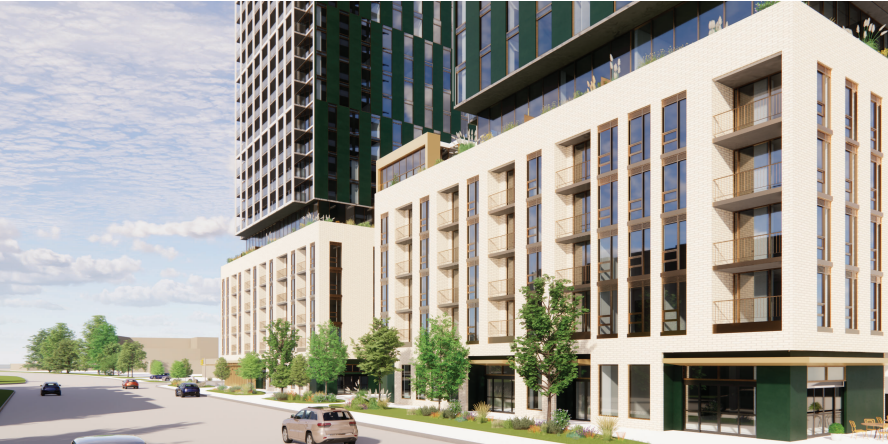 Description of the revised proposal: A high-rise mixed-use development consisting of two towers of 28 and 30 storeys on a 5-storey base podium. The revised proposal includes 588 dwelling units, 734 square metres of commercial space, 6,315 sq m of amenity space, 292 vehicle parking spaces and 583 bicycle parking spaces.